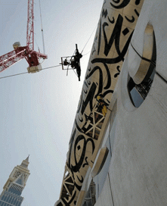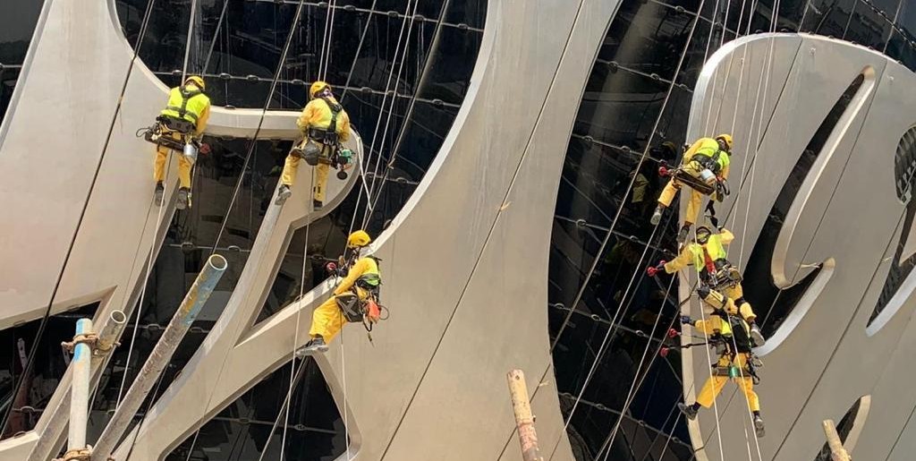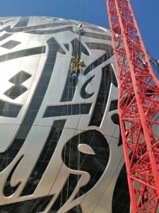 The structure’s curvature, Arabic calligraphy, and limited access to inverted surfaces required meticulous planning, precision, and advanced rope access solutions.